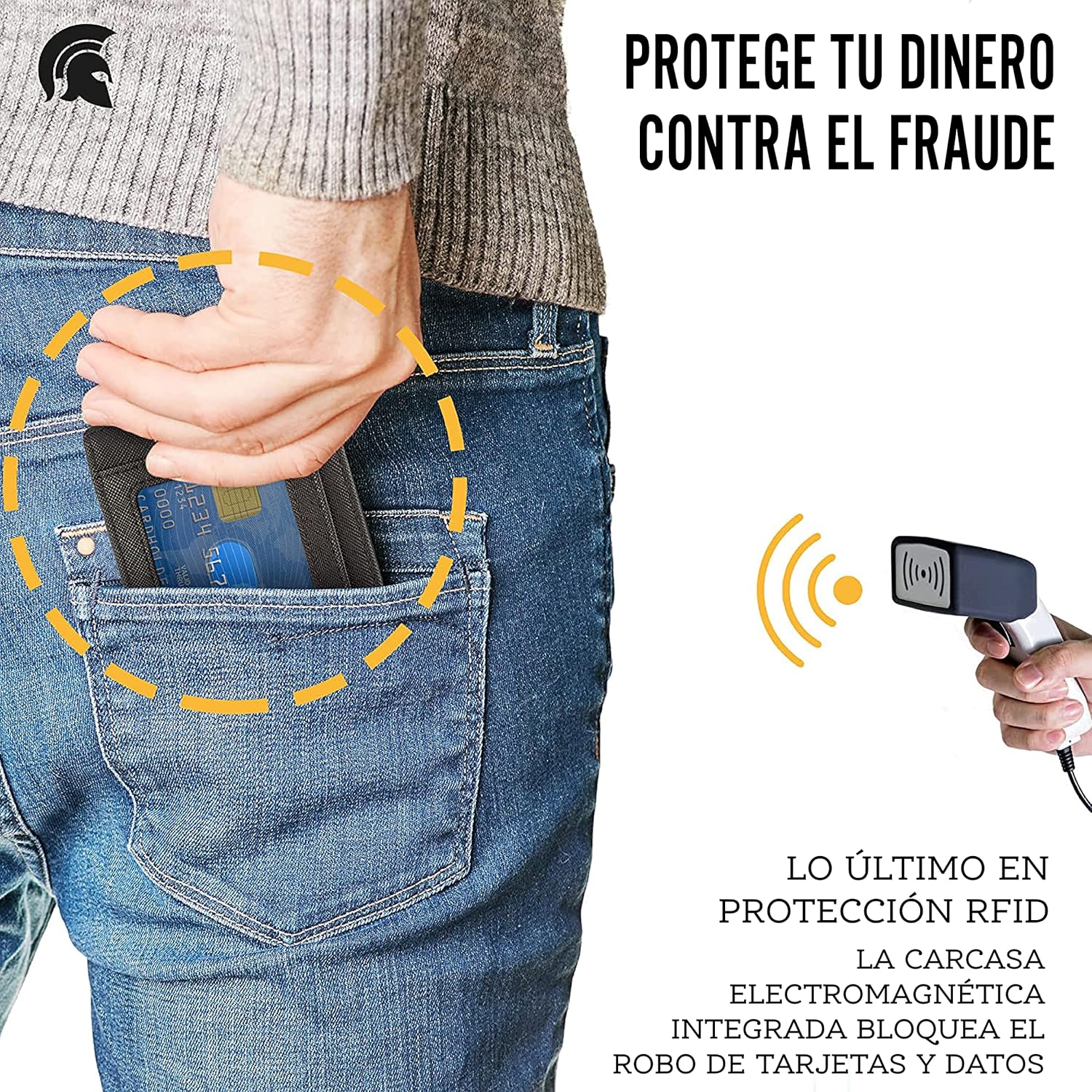 PROTECCIÓN MÁXIMA - Nuestras carteras de hombre tarjetero han sido rigurosamente probadas para bloquear las señales de todas las tarjetas de crédito, débito, de conducir y tarjetas de identificación que funcionan a una frecuencia de 13,56 MHz. (Algunas tarjetas de Identidad antiguas y llaves de habitaciones de hotel que operen por debajo de 125 KHz seguirán funcionando dentro de esta tarjetero hombre pequeño compacto).