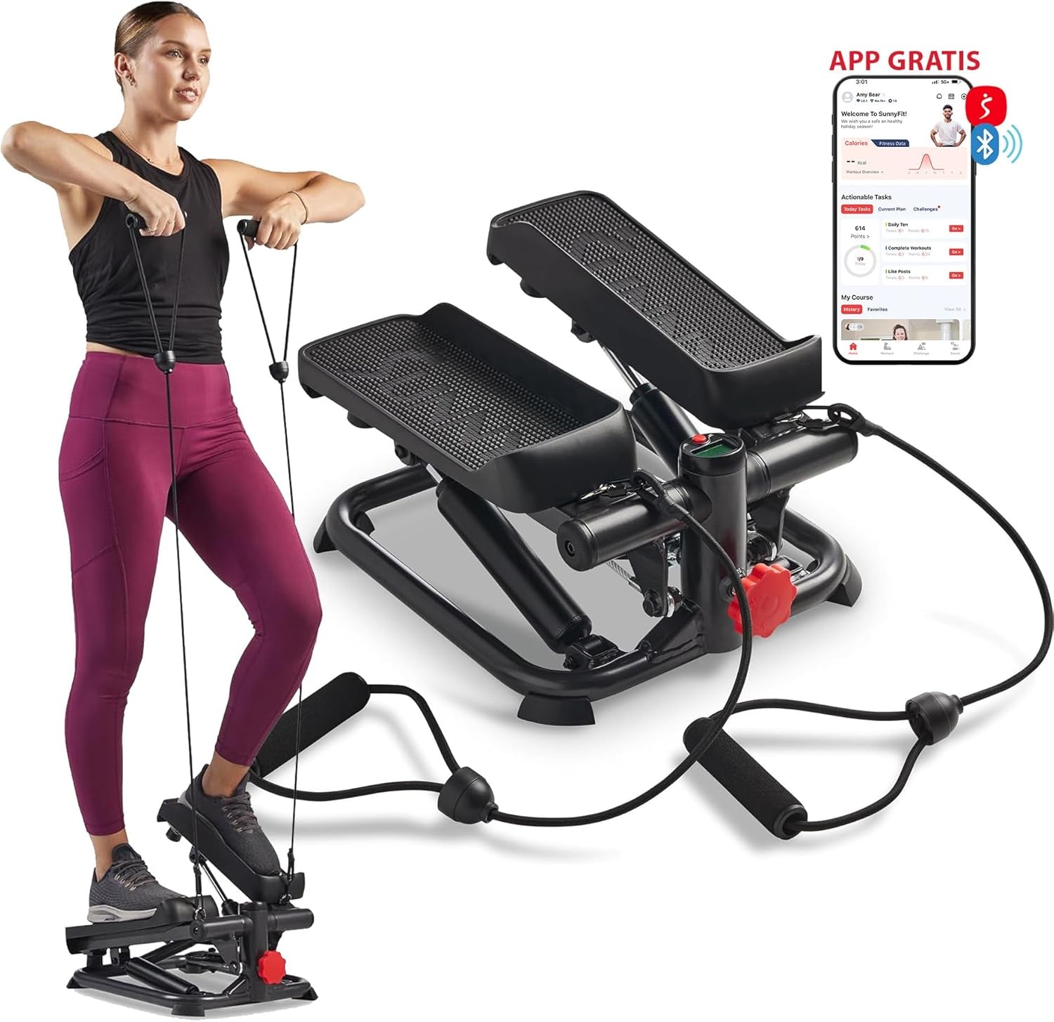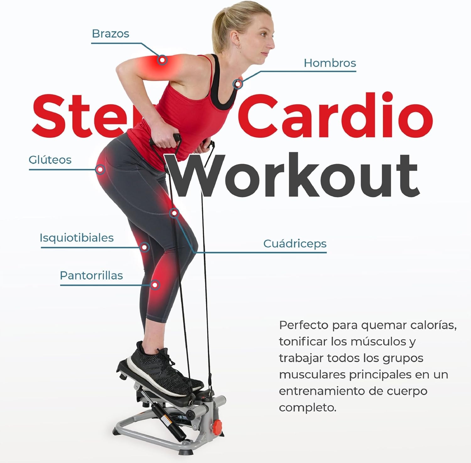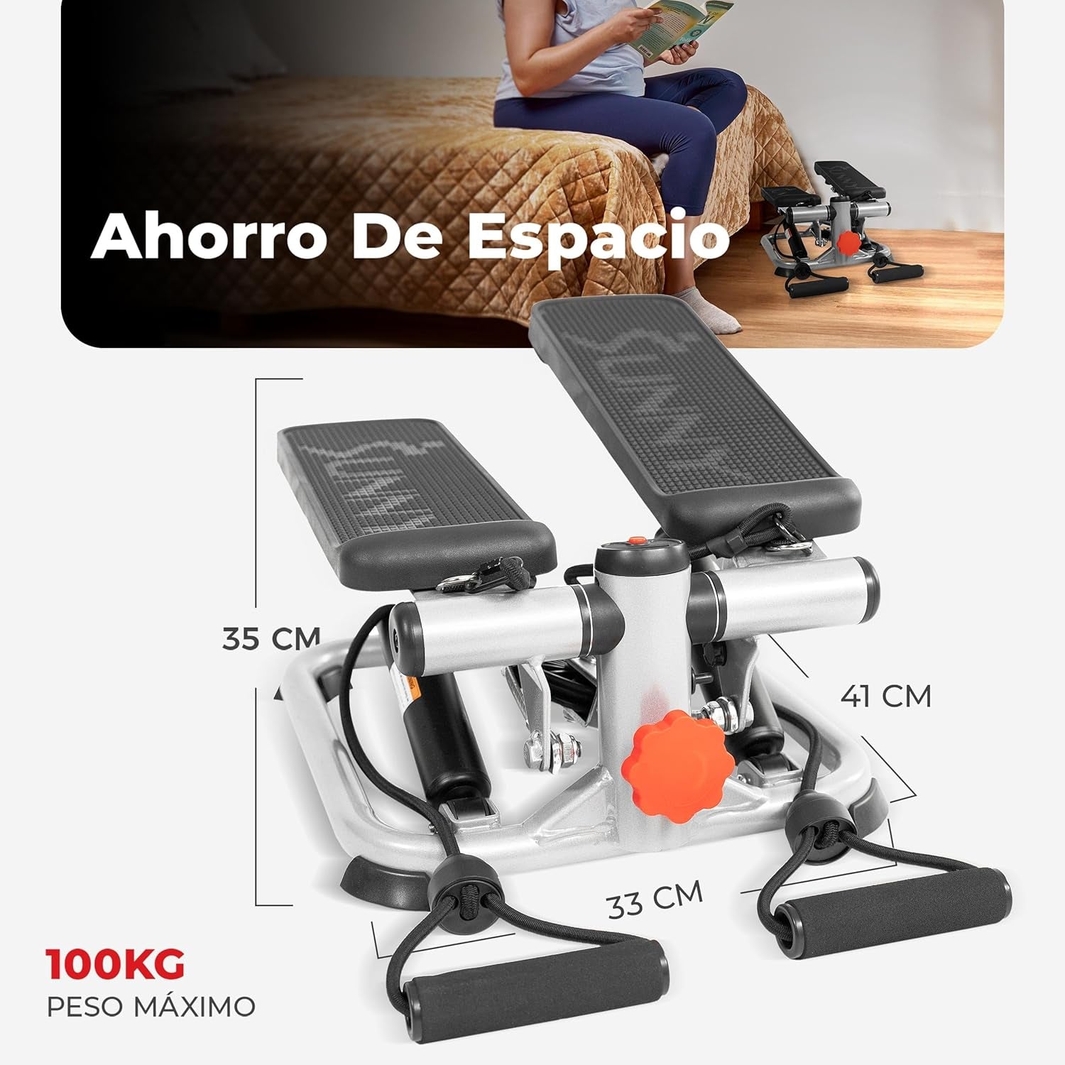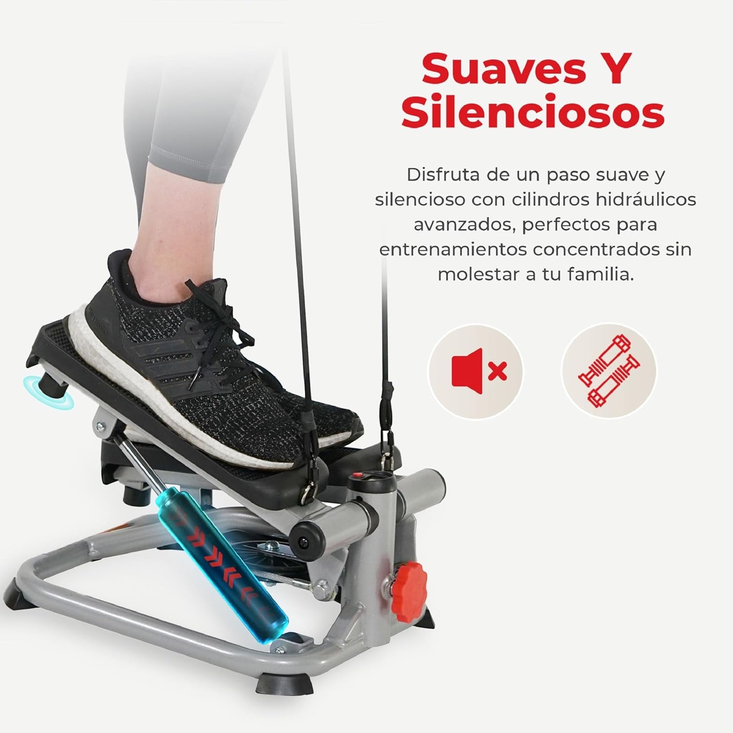 El stepper 2 en 1 permite a los usuarios realizar ejercicios de pasos para apuntar a la parte inferior del cuerpo y al mismo tiempo incorpora entrenamientos con bandas de resistencia para involucrar los músculos de la parte superior del cuerpo.